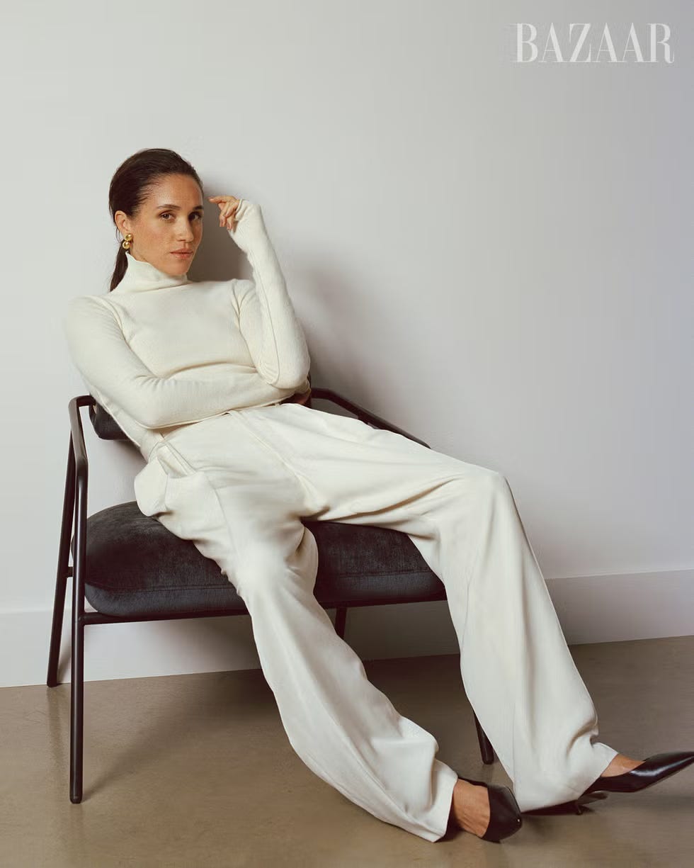 Her channel of choice is always a controlled, highly stylised, gushy editorial piece, full of curated anecdotes and personal revelations that reveal nothing, except that no one in the world but Harry “loves me more,” with Meghan offering no return comment about him.