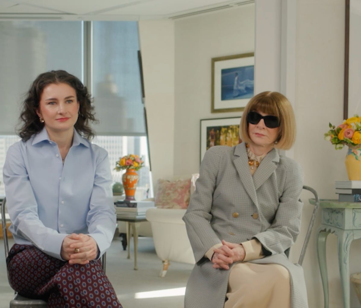 There’s rigid body language. Nervous laughter from Malle, who glances at Wintour every other answer, especially when she says something vaguely punchy. Passive, elliptical responses. And Anna: scowling, inscrutable, looking like she would rather be literally anywhere else.