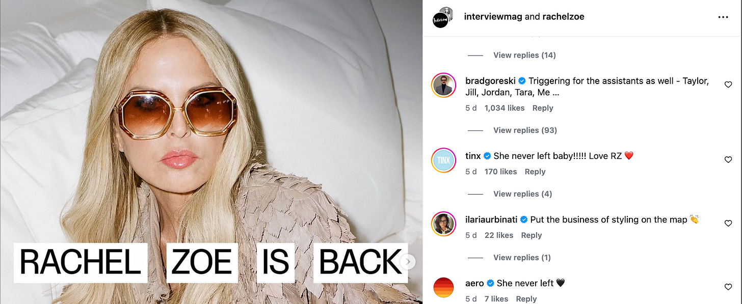 This comment from Brad Goreski on a post from Interview Mag with Rachel Zoe sent me straight back to 2010. A friend recently told me comment sections are the only place online that still feels messy and unfiltered, and I couldn’t agree more. Thank god.