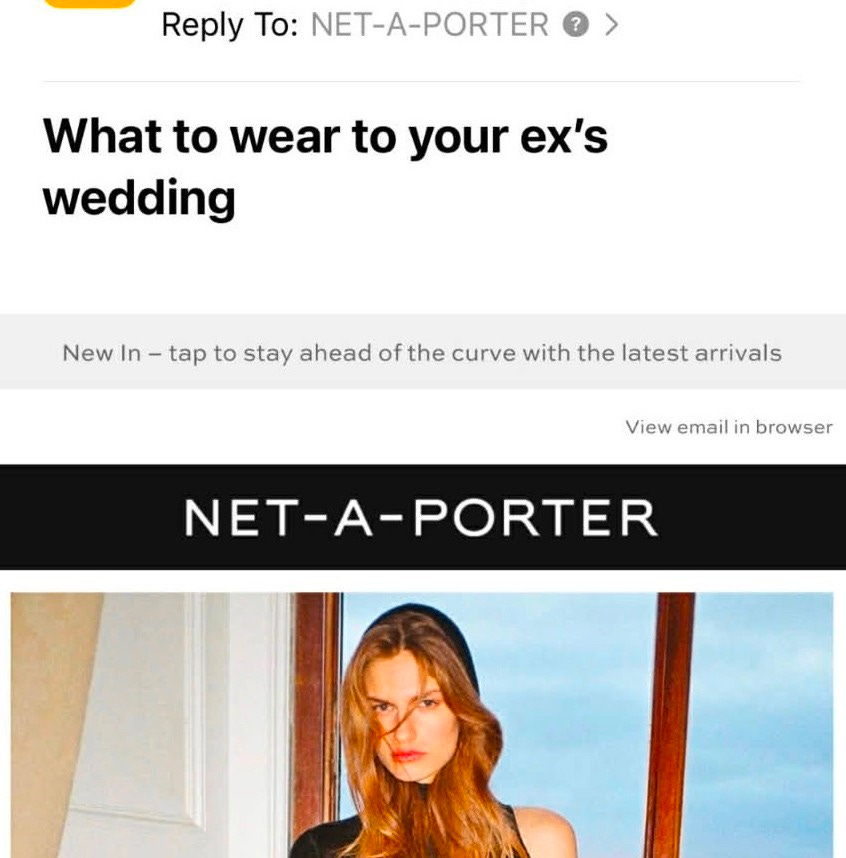 Someone at Net-a-Porter deserves a raise. This email subject line made me laugh and raised an important question: is there an untapped demographic of people forced to attend an ex’s wedding out there?