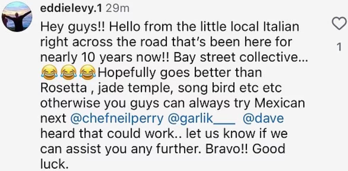 Levy left a comment on a Gran Torino Instagram post, which was picked up online before being deleted.